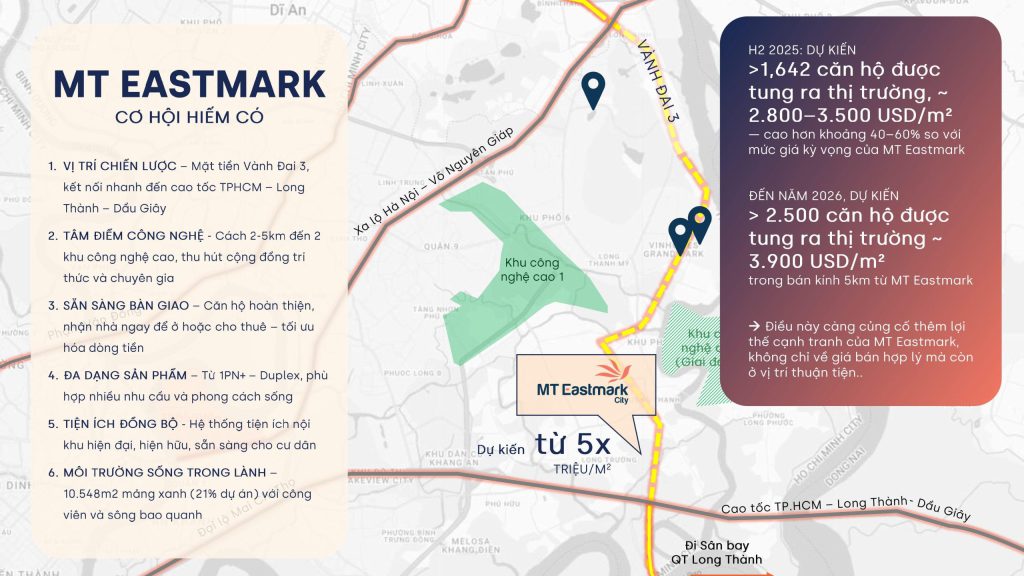 Nhờ vị trí chiến lược, tiện ích đồng bộ và nguồn cầu thuê thực, MT Eastmark City không chỉ là tài sản “an cư sinh lời”, mà còn là kênh đầu tư thông minh, mang lại dòng tiền ổn định, lợi nhuận cao và giá trị tích lũy lâu dài một lựa chọn sáng suốt cho nhà đầu tư đón đầu nhịp phát triển của Quận 9 tương lai.